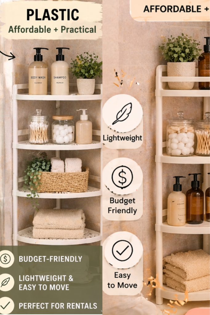 If you’re looking for something simple and budget-friendly, plastic corner shelves are a great choice.